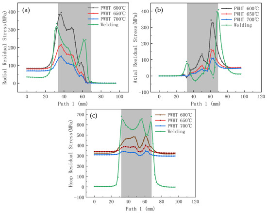 The heat treatment temperatures of 600 °C, 650 °C, and 700 °C were selected to study in accordance with the requirements of GB/T30583-2014. The residual stresses under different heat treatment temperatures were obtained by finite element analysis. Figure 12 shows the radial, axial, and hoop residual stress distribution of path 1 with varying heating temperatures.