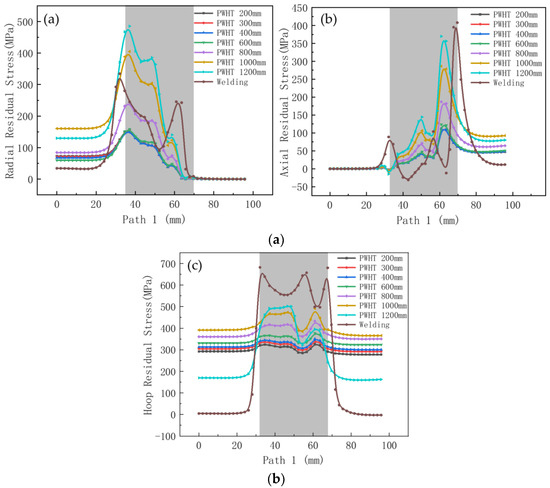 Effect of PWHT width on the residual stress distribution of Path 1: (a) radial, (b) axial, (c) hoop residual stress.