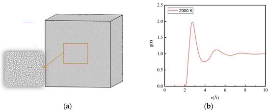 The microstructural evolution during solidification was observed using the visualization software OVITO [30]. The adaptive common neighbor analysis (CNA) method was used to determine the local environment of atoms [31]. CNA determines the atomic type by calculating the topology of the first-nearest neighbors of each atom. Comparing the calculated values with known characteristics of standard crystals can distinguish the local atomistic crystal structures. Atoms that do not identify as FCC structures, HCP structures, BCC structures, or any other crystal type in OVITO are identified as ICO liquid or ICO solid atoms. As shown in Figure 1a, the atoms in the 2000 K Al melt are all identified to be an ICO liquid structure. Its radial distribution function (RDF) is shown in Figure 1b, and there is no long-range peak in the curve, which proves that Al was completely melted at 2000 K.