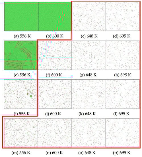 In summary, after cooling to 695 and 648 K at cooling rates of 2.0 × 1010 K/s, 2.0 × 1011 K/s, 2.0 × 1012 K/s, and 2.0 × 1013 K/s; to 600 K at cooling rates of 2.0 × 1011 K/s, 2.0 × 1012 K/s, and 2.0 × 1013 K/s; and to 556 K at a cooling rate of 2.0 × 1013 K/s, relatively pure supercooled liquid melts can be obtained, excluding heterogeneous nucleation points, as shown in the red wireframe in Figure 2, whose results were used in the isothermal solidification process.