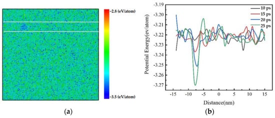 The potential energy of the Al melt was calculated to understand the energy fluctuations during the nucleation process. Figure 3a shows the local potential energy for Al melt with an isothermal time of 25 ps at a 2.0 × 1011 K/s cooling rate. It can be found that the potential energies of atoms or clusters are different everywhere, and the blue aggregated area between the white lines is darker and larger. The area between the white lines was selected for potential energy calculation. The average value of potential energy was calculated every 1 nm from left to right along the white line, as shown in Figure 3b. It can be seen that the potential energy curve fluctuates irregularly with time, proving that there are energy fluctuations inside the supercooled Al melt, and the energy fluctuations around the nucleation region are the largest, which is consistent with the results based on CNT [9].