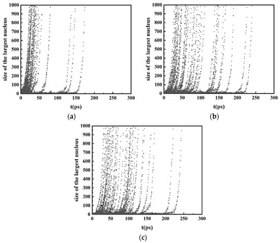 It is difficult to directly obtain the nucleation rate and critical size from MD [33]. In this study, MFPT [33,34,35,36] is used to analyze the kinetics of the nucleation, which allows simple and straightforward modeling of various parameters in the nucleation process using purely kinetic methods. In the MFPT method, only the number of atoms in the largest cluster in a certain time and the average time of its appearance need to be counted. The number of atoms in the largest cluster is obtained from the cluster analysis in OVITO. Two atoms belong to the same nucleus if they are within the nearest-neighbor distance of each other, which is identified from the RDF [37]. Figure 4 shows the evolution of the number of atoms contained in the largest cluster during the isothermal process at three different cooling rates. The data in each figure are the results of 50 simulations.