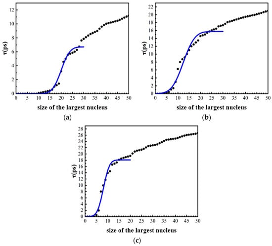 Figure 5 shows the MFPT curves of the largest cluster during the isothermal solidification process with different cooling rates, the abscissa is the number of atoms in the largest cluster, and the ordinate is the average time. The black point is the average time of the largest cluster appearing in 50 simulations, which is obtained by first interpolating the data and then averaging the time at which the largest clusters appear. The blue curve is the result obtained after fitting according to the MFPT Equation (1) [36].