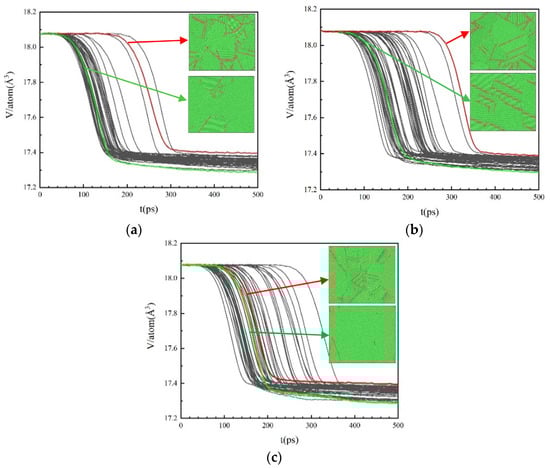 Figure 6 is the evolution curves of the atomic volume during the isothermal solidification process after cooling at different cooling rates for 50 times. The red and green curves represent the minimum and maximum volume changes in 50 simulations, respectively. The microstructures at the end of crystallization for both cases are shown in the inset of Figure 6. It can be found that when the volume change is small, the proportion of HCP atoms in the system is high, and the grains with different orientations are more. In the case of a large volume change, the proportion of HCP atoms is low, and the grain orientation is relatively similar.