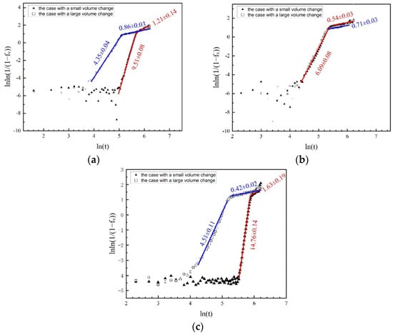 Substituting calculated from Equation (3) in both cases into Equation (2), the relationship between and is obtained, as shown in Figure 7. The blue curve represents the case with a large volume change, and the red curve represents the case with a small volume change. The slope of the curve is the Avrami exponent , which is indicated in the figure. In Figure 7, the whole process can be divided into three stages. The first stage is too dispersive and, thus, not fitted. In the second stage, becomes larger, with the main growth stage of grains, and is between ~4 and ~15, indicating that nucleation and growth processes are a three-dimensional growth mode [26]. In the subsequent third stage, growth becomes slow again, mainly due to the depletion of the parent phase during growth [36].