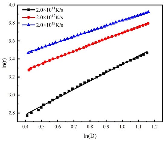Here, is the grain size at time , is the constant, and is the growth exponent. Taking the logarithm of both sides of Equation (4), we obtain