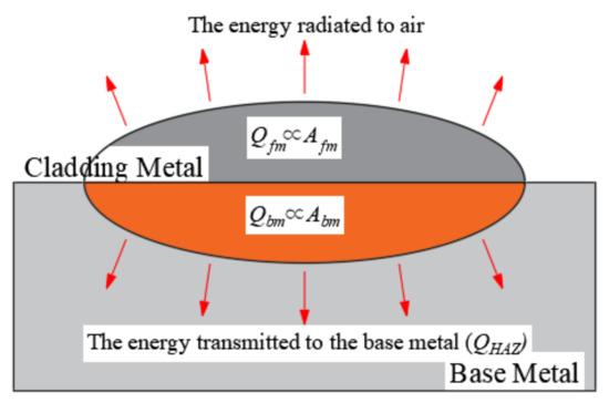 For cladding welding of nuclear power components, a NiCrFe nickel-based alloy is generally used as the welding wire; a FeCrNi austenitic stainless steel is often used as the deposited metal for the pipes. As a simplified approximation, this study ignores the difference in melting latent heat and specific heat capacity between the weldment and the welding wire; it uses the ratio of the base metal melting heat power (Qbm) and the welding material melting heat power (Qfm) to approximately replace the ratio of the base metal melting cross-sectional area and the deposited weld bead cross-sectional area. The heat ratio is used to replace the cross-sectional area ratio to calculate the weld dilution ratio [18,19]. As shown in Figure 2.