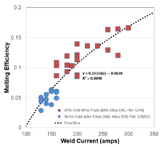 Relationship between the welding current and base metal melting efficiency summarized by EPRI [19].