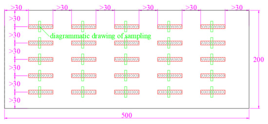 Twenty-five beads for analysis of the dilution ratio were planned to be uniformly spaced on the substrate plate, as shown in Figure 4. These beads were formed with various AMPs, welding speeds and wire feeding speeds. The substrate plate should be cooled to room temperature before the welding of the next bead. The arc length was held constant at about 3 mm by the arc voltage tracking system of the SNPI Model D when welding. Samples were taken out at the center (from the beginning to the end) of the beads when all of the beads were completed, as shown in Figure 4. The cross-section macro metallograph of all samples was observed with an optical microscope designated as Observe A3, produced by ZEISS (Oberkochen, Germany).