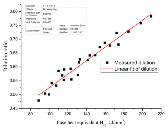 Since and is expressed with the fuse heat equivalent as the only variable, the weld dilution ratio is also expressed as and for the only representation. Thus, the weld dilution rate can be uniquely characterized by the fuse heat equivalent.