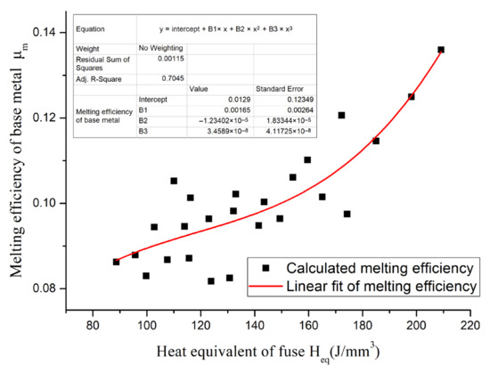 The curve of the base metal melting efficiency changing with the fuse heat equivalent is obtained by using the fuse heat equivalent calculation, as shown in Figure 8. With the increase in the heat equivalent of the fuse, the melting efficiency of the base metal increases.