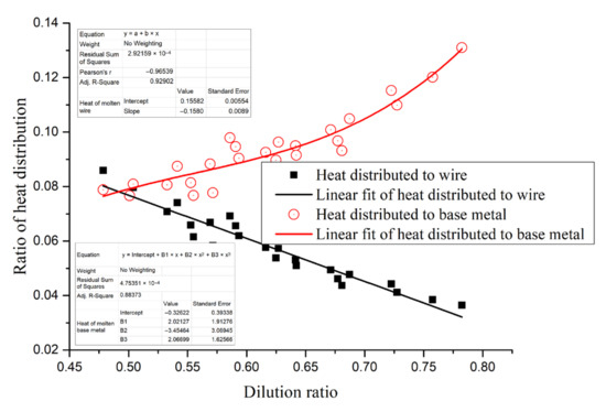 Figure 9 shows the change trend of the linear energy ratio of the molten welding wire and molten base metal with the increase in the dilution ratio.