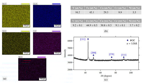 (a) EDX maps of Fe, Co, Cr, V, and Ni confirming the ingot’s homogeneity. (b) The nominal composition in wt.% and at.%. (c) XRD analysis of a specimen following homogenization and solution heat treatments. The results point to a single FCC phase with a lattice parameter .