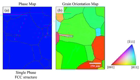 (a) EBSD phase map showing a single FCC phase following homogenization and solution heat treatments. (b) The corresponding grain orientation map.