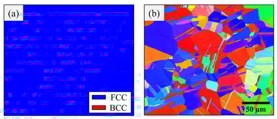 (a) EBSD phase map following homogenization, rolling, and solution heat treatment. (b) The corresponding grain orientation map.