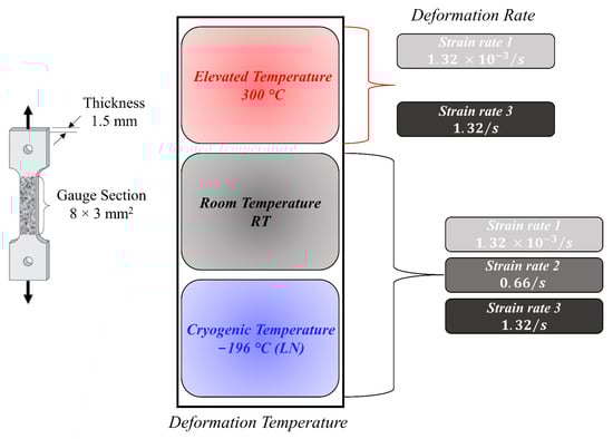 Tensile experiments were conducted at different temperatures and deformation rates using a universal testing machine equipped with an environmental chamber (Instron, Norwood, MA, USA). Three different strain rates were considered, 1.32 × 10−3/s (1 mm/min. crosshead speed), 0.66/s (500 mm/min crosshead speed), and 1.32/s (1000 mm/min, which is the maximum achievable speed in the utilized setup). For each strain rate, specimens were tested at room temperature (RT, 293 K), cryogenic temperature 77 K, and a high temperature of 573 K (the maximum attainable temperature for the utilized environmental chamber). The considered conditions are explained schematically in Figure 4. For the RT experiments, optical images were captured during deformation using a high-resolution camera connected to VIC-snap with a capture rate of 1 image per 500 ms (milliseconds). VIC-2D 6 commercial software from Correlated Solutions (Irmo, SC, USA) was used to measure the displacement fields and calculate the associated strains. During the tests at 77 K, the specimen along with the grips were submerged in a liquid nitrogen (LN) bath and soaked for about 5 min prior to load application. For the experiments conducted at 300 °C, an environmental chamber was utilized for heating. The loading was initiated after a 20 min soaking time at 300 °C. For each of the considered conditions, at least three samples were tested.