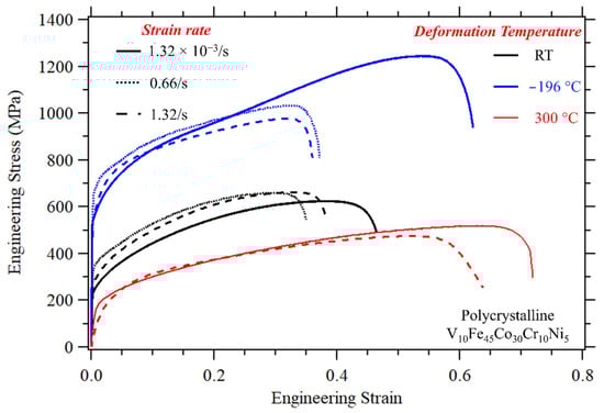 In this work, the V10Fe45Co30Cr10Ni5 TWIP/TRIP MPEA was investigated under tension at different deformation rates (1.32 × 10−3/s to 1.32/s, 1000 times faster) and deformation temperatures, extending from cryogenic (−196 °C) to elevated (300 °C). The mechanical properties were evaluated and compared for all the considered conditions. EBSD and XRD analysis were also conducted to shed light onto the dominant deformation mechanisms (i.e., slip, TWIP, and TRIP). The results were analyzed in terms of the mechanical properties, strength, ductility, and hardening rates, with the aim to provide a deeper understanding of how deformation rate and temperature affect the plasticity mechanism and, consequently, the attained strength and ductility levels in this novel and unique MPEA. The work supports the following conclusions: