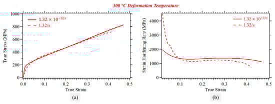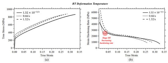 As for the elevated temperature conditions, Figure 14 shows representative true stress-strain curves with the corresponding strain-hardening rates. Only two deformation rates are shown here due to a limited number of available specimens. Compared to either the RT or cryogenic deformation temperatures, the cases presented here exhibit no signs of Stage III, which suggests slip dominance and absence of either TRIP (unlikely given limited TRIP observation even at RT) or TWIP. Increasing the deformation temperatures reduces slip resistance with generally limited impact on the critical resolved shear stress to initiate deformation twinning. However, it should be noted here that deformation rate also impacts the tendency of the material to deform by twinning. Unfortunately, this was not possible to examine in this study, but is an objective that is worthy of further investigation.
