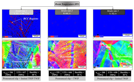 The intermediate deformation rate (—RT deformation) stands out in this material and exhibits a notably different response compared to the other deformation rates (faster and slower). As shown in Figure 6b, the hardening rate curve shows evidence of Stage III, where the strain-hardening rate increases following Stage II. The presence of this stage is a clear indication of TWIP and/or TRIP effects while its absence points to slip dominance. The increase in hardening rates is attributed to the reduction in slip length due to the additional interfaces generated by TWIP/TRIP. This response is similar to the Hall–Petch effect associated with grain boundary strengthening. The EBSD grain orientation and phase maps presented in Figure 7b and Figure 8 point to a lack of TRIP but significant slip and TWIP activities. Note that the strength levels for this case were higher compared to the other considered deformation rates but with slightly lower ductility (see Figure 5). Clearly, the results presented here for RT deformation highlight the complexity of interactions taking place and affecting the plastic response and activated deformation mechanisms. The trends are nonlinear with TWIP favored at the intermediate deformation rate while TRIP was observed, although limited, only at the slowest deformation rate. All observations and major results for the RT deformation conditions are summarized in Figure 8.