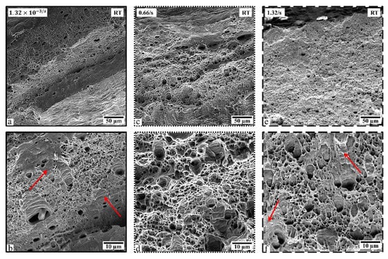 Fractographs of tensile specimens deformed at RT at a rate of 1.32 × 10−3/s (a,b), 0.66/s (c,d), and 1.32/s (e,f). The red arrow point to flat fracture regions.