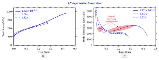 Strain hardening develops in the material due to plastic strain accumulation. Various aspects influence this phenomenon, including dislocation multiplication and dislocation interface interaction (e.g., grain boundaries and phase boundaries). For example, the TWIP effect introduces additional interfaces (i.e., twin boundaries) that act as obstacles for dislocation motion, increasing strength, and hardening levels. A similar effect takes place in the case of TRIP due to the introduction of phase boundaries [59]. As the investigated material in this study exhibits TWIP and TRIP depending on the deformation temperature [10,56], quantifying the hardening level for the different considered conditions is extremely important. The hardening responses of the investigated samples can be better quantified by calculating the material hardening rates dσ/dε.