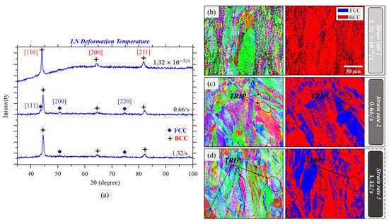 (a) XRD analysis collected from fractured samples deformed at −196 °C and the three considered deformation rates. (b) EBSD grain orientation and phase maps of a sample deformed at −196 °C and 1.32 × 10−3/s deformation rate. (c) −196 °C and 0.66/s deformation rate. (d) −196 °C and 1.32/s deformation rate.