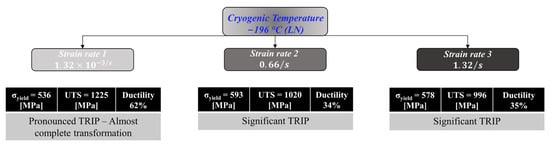 The grain orientation and phase maps presented in Figure 11 confirm the significant contribution of TRIP at this deformation temperature. For all the considered deformation rates, a significant volume fraction of the BCC phase was detected. The extent of TRIP (BCC phase) was, however, dependent on the deformation rate. As highlighted in Figure 11b, at the slowest considered deformation rate (), almost the entire sample transformed to BCC. The significant TRIP in this case allowed for pronounced hardening (Figure 10b) and consequently, superior strength and ductility levels, the best among all the considered samples. For the other deformation rates, both exhibited significant TRIP, with the sample deformed at the fastest rate () showing slightly less BCC volume fraction compared to the sample deformed at the intermediate rate of (63% compared to 71% BCC volume fraction). Clearly, increasing the deformation rate is not conducive to TRIP and thus hinders the hardening capacity. Jo et al. also observed a significant reduction in the BCC volume fraction (almost 50% reduction) at an ultra-high deformation rate of compared to quasi-static loading conditions [56]. The results presented in this study highlight that even at slower deformation rates, a significant impact and hindrance of TRIP can be expected in this material system. As detailed above in Figure 5 and Table 1, this adversely impacts the resulting mechanical properties in terms of strength and ductility levels. A summary of the observations and major results for the cryogenic deformation temperature conditions is shown in Figure 12.