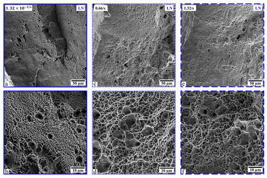 Fractographs of tensile specimens deformed at −196 °C at a rate of 1.32 × 10−3/s (a,b), 0.66/s (c,d), and 1.32/s (e,f).