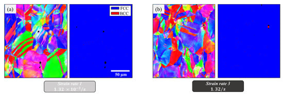 (a) EBSD grain orientation and phase maps of a sample deformed at 300 °C and 1.32 × 10−3/s deformation rate. (b) 300 °C and 1.32/s deformation rate.