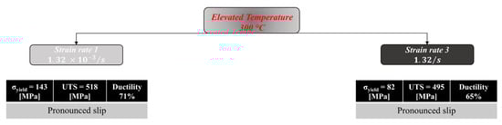 Increasing the deformation temperature to 300 °C (red curves in Figure 5) resulted in enhanced ductility levels; however, this was accompanied by a significant strength reduction. Due to the limited number of available specimens, only two deformation rates were considered at this temperature. After increasing the strain rate, the expected reduction in ductility was observed consistently across all temperatures. However, unlike the results obtained at RT and 77 K, both the yield strength and UTS dropped compared to the slow strain rate results. This aspect is discussed further in Section 3.2.