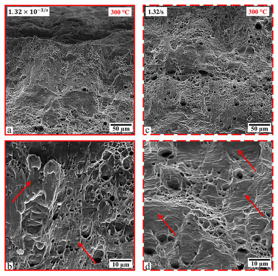 Fractographs of tensile specimens deformed at 300 °C at a rate of 1.32 × 10−3/s (a,b), and 1.32/s (c,d). The red arrow point to flat fracture regions.