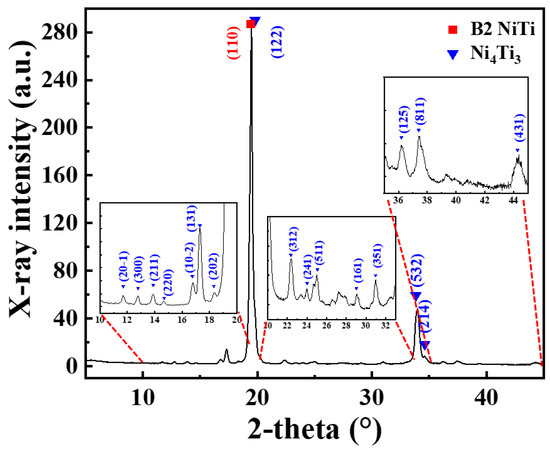 Figure 1 shows the XRD pattern of 60NiTi quenched in silicone oil with a temperature of 200 °C after solution at 980 °C for 4 h. The XRD result indicated that the 60NiTi alloy consisted of the cubic B2–NiTi matrix phase and rhombohedral Ni4Ti3 phase. According to previous studies, the content of the B2–NiTi matrix phase in 60NiTi is usually only about 30%; and the Ni4Ti3 phase is about 70% [12,15,18]. The lattice parameters of B2–NiTi and Ni4Ti3 can be determined from the d-spacing values of the XRD results in this work [19]: B2–NiTi (a = b = c = 2.966 Å); and Ni4Ti3 (a = b = 11.085 Å, c = 5.224 Å). Compared with the standard PDF card, it can be seen that both the B2–NiTi matrix and the Ni4Ti3 phase have lattice distortion; this may be caused by the internal stress generated during the hot-oil quenching process.