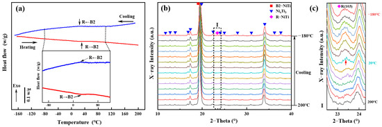 (a) The DSC curve of the 60NiTi sample; (b) one−dimensional XRD patterns during cooling; and (c) enlarged views of the corresponding lines in the dotted box of (b).