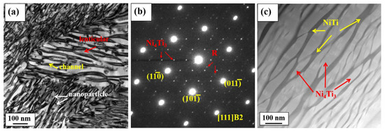 In order to identify the special fine NiTi phase in lenticular Ni4Ti3, high magnification images and their corresponding STEM were taken; this is shown in Figure 4a,b. The NiTi phase inside Ni4Ti3 is lath shape of about 15 nm. Figure 4c,d show the high-resolution TEM micrograph of a small lath and the corresponding fast Fourier transform (FFT) image. It is seen that the superlattice reflections at the 1/3 positions in the B2 diffraction spots demonstrate the small NiTi lath is R phase. No R phase was detected in the above room temperature XRD pattern; this is probably because of the nanoscale size and a small number of R phases. Therefore, the NiTi exhibit two phases in dual-scale: one is the B2 parent phase showing a large-size lamellar structure with a Ni4Ti3 phase; and the other is the nano-R phase distributed inside the Ni4Ti3 phase. The nano NiTi phases are strongly constrained and internally stressed inside the Ni4Ti3 phase; embodying their transformation to the small strain-scale R phase, as shown in Figure 4c.