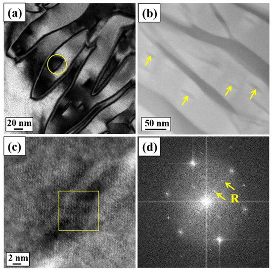 (a) The fine lath-like NiTi phase in the lenticular Ni4Ti3 phase; (b) a STEM image; (c) a high-resolution TEM image of the lath structure; (d) and the phase identification results according to the diffraction points of the FFT image in (c).