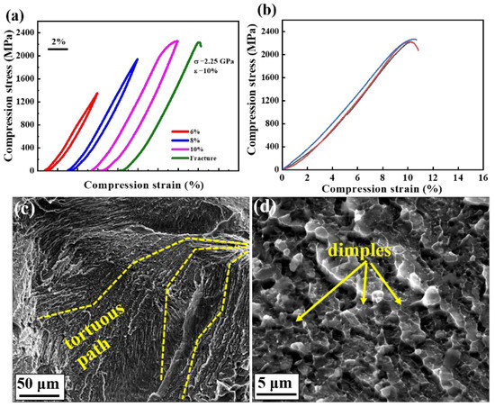 Figure 5c shows the compressive fracture morphology of the sample, in which the yellow dotted line indicates that the crack propagation path is tortuous; indicating that crack propagations were hindered by the lamellar structure. In the higher magnification images (Figure 5d), the part fracture exhibits typical dimple features; implying that the NiTi component underwent a relatively complete phase transformation process. These two factors promoted the 60NiTi to undergo extensive ductile deformation before fracture.