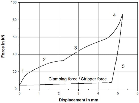 Characteristic force–displacement curve of the clinching process, where labels 1 to 5 stand for the successive stages of the clinching process: elastic deformation of the components (1), elastic-plastic deformation of the components (2), penetration of the punch (3), reaching the maximum process force (4) and return stroke (5).