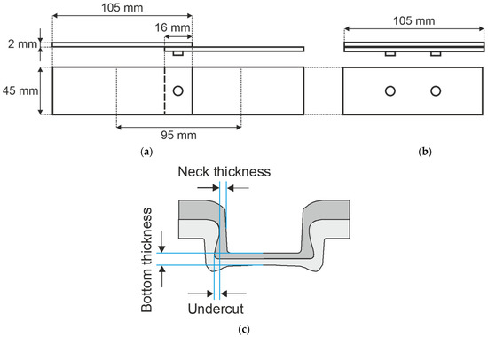 Specimen geometry for (a) shear tensile testing and (b) structural investigations and (c) schematic of the measurement of relevant features of the clinch joint geometries in a cross-section.