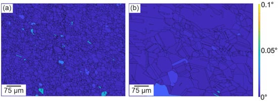 According to the procedure described in the previous section, EBSD measurements were first carried out on the electro-chemically polished samples. The grain orientation spread (GOS) in both initial conditions, AR and HT, are depicted in Figure 4 It can be observed that the spread is less than 0.1° in both conditions. As was shown for an Mg-Zn-Zr alloy in [22], investigating the effect of dynamic recrystallization on grain distortion, GOS can be applied to analyze the deformation states represented in a microstructure. Hence, the very low GOS value observable in both conditions of the base plates suggests that the initial microstructure can be assumed to be undeformed. The heat treatment, however, led to a pronounced recrystallization of the sheets, as shown by the pronounced variation in the grain size between both conditions, comparing Figure 4a with Figure 4b. In addition, the phase contents of the bcc and fcc were measured, and both conditions were fully fcc, i.e., austenitic.
