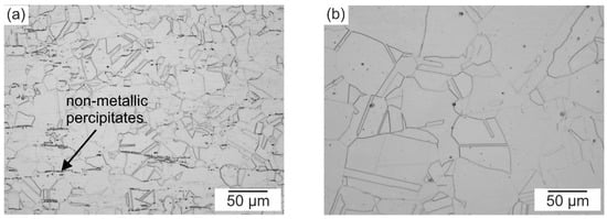 Figure 5 shows the results of the LOM for the base materials in the AR condition (a) and HT condition (b). It can be seen that the heat treatment, at 1090 °C for 1 h, resulted in significant grain and twin coarsening. Apart from this, the linearly oriented precipitates, as depicted in Figure 5a, seem to somewhat follow the rolling direction, whereas the precipitates in the HT condition (Figure 5b) are less frequent and do not show any preferentially oriented lineup.