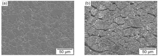 The heat treatment did not only have a significant effect on the microstructure of the rolled sheets made from AISI 304. The surface was also significantly affected, as can be seen in the SEM images shown in Figure 6. Figure 6a shows the AR condition and Figure 6b shows the HT condition. Figure 6a depicts the rolled surface, which is characterized by a smooth surface, where the grain morphology is visible. In contrast, the heat treatment resulted in strong oxidation on the surface, which was porous and cratered, as can be seen in Figure 6b.