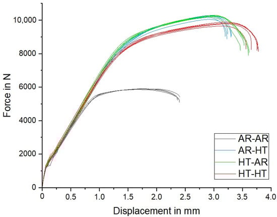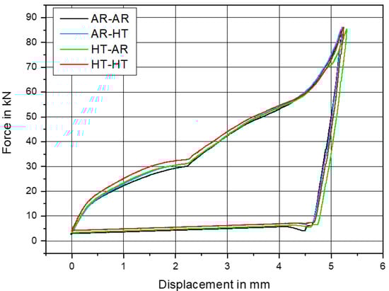 The first point that stands out is that the AR-AR series lags far behind the rest of the series in terms of both the maximum force and maximum displacement achieved. The numerical values are listed in Table 6. The mixed joints, AR-HT and HT-AR, achieved the highest tensile forces, with HT-AR additionally exhibiting a displacement increased by approx. 10%. In contrast, the maximum tensile force achieved by HT-HT was approx. 5% lower, with roughly the same elongation as that of HT-AR.
