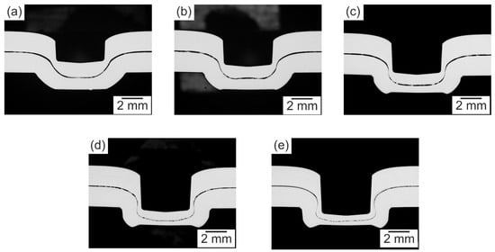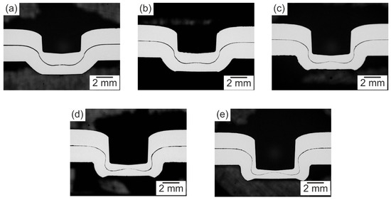 Cross-sections of the clinch samples in the condition of HT-HT with a punch depth of (a) 1 mm, (b) 2 mm, (c) 3 mm, (d) 4 mm and (e) 5 mm.