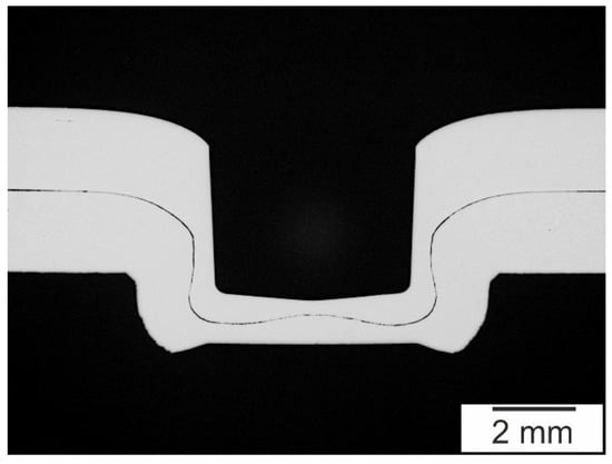 Representative of the mixed joints of an AR and HT sheet, the final state (i.e., where the clinching process has been executed to the full depth, and the punch has been released again) of the AR-HT clinch joint is shown in Figure 10. It can be seen that there is an uneven distribution of the sheet thicknesses in the center of the bottom part due to the roughness of the HT sheet; however, it is less distinct than in the HT-HT condition.
