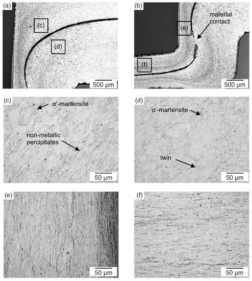 In Figure 11b, a partial material contact can be seen. This is plausible, according to a numerical simulation used for an HCT590X clinched joint by Steinfelder et al. [24], which identified the region situated immediately above the undercut as the location with the highest surface pressure within the clinching point. Comparing this with Figure 11c,d, it can be seen that the volume fraction of the deformation-induced α’-martensite forms—which can be seen in the fine, structured, inner-grain areas—increases with the increasing degree of deformation. Individual grains are hardly recognizable at these high degrees of deformation, as shown in Figure 11e,f, which is reflected in the reduction in the sheet thickness in the neck from an initial thickness of 2 mm to less than half a millimeter. The formation of deformation-induced α’-martensite can be estimated only from darker etched areas in the images.