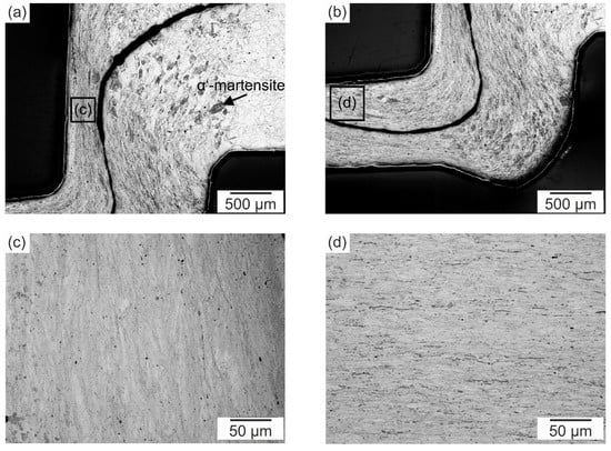 In the case of the HT condition, the heat treatment resulted in significant grain coarsening. This can be seen in the images of the clinched HT-HT sample in Figure 12. The α’-martensite induced by the deformation is also clearly visible in the overview images of the transition from the base material to the neck in Figure 12a and the transition from the neck to the bottom in Figure 12b. However, in the detailed images of the neck in Figure 12c and the bottom in Figure 12d, a similar picture emerges as that observed before for the AR-AR specimen. Individual grains and α’-martensites are difficult to identify due to the very high degrees of deformation. Therefore, it was not possible to determine the α’-martensite content based on these images.