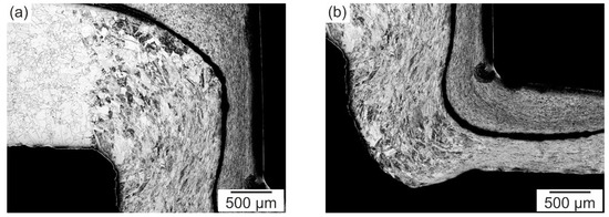 Representative of the mixed joints, the overview images of the AR-HT joint are shown in Figure 13. Figure 13a shows the transition from the base material to the neck, and Figure 13b shows the transition from the neck to the bottom. It can be seen that the punch-side AR sheet is similar to the punch-side sheet in the AR-AR, and the die-side HT sheet is similar to the die-side sheet in the HT-HT joint. Furthermore, it can be seen from Figure 13b that the high degrees of deformation in the bottom caused both sheets to be deformed to such an extent that the differences in the initial condition can no longer be clearly distinguished. Due to the existing oxide layer, material contact could not be observed for joints with at least one heat-treated sheet, preventing direct contact between the sheets.