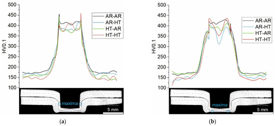 For the further characterization of the clinched joints, hardness measurements were performed on the cross-sections of the fully clinched joints. The results are shown in Figure 14 where, in the diagrams, the hardness is plotted against the location of the measured values, as illustrated by a clinch point cross-section. Figure 14a shows the measured values of the plate on the punch-side and (b) shows the measured values of the plate on the die-side.