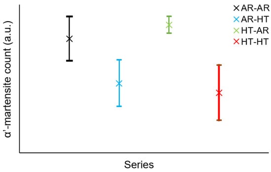 The fact that the clinch joints, especially AR-AR, compared to the rest of the series, show significant differences in the local degree of deformation made it difficult to use the hardness as an indication of α’-martensite formation. The very high degrees of deformation and associated distortion of the metal lattice in the neck and bottom regions also made it very difficult to determine the α’-martensite volume fractions by optical measurements or EBSD. In order to perform a qualitative assessment of the α’-martensite formation, measurements were carried out using a feritscope on the die-side sheets of the clinch points of the manufactured tensile test specimens. Since a clinch joint has a very complex joining geometry, and it is not possible to determine the exact volume measured by the feritscope, the specification of the measured values was omitted in favor of a qualitative assessment. This is shown in Figure 15, where the measured intensities of the magnetic signal for the four series are displayed. As mentioned, the measurements were taken from the die-side sheets, i.e., on the AR sheets for AR-AR and HT-AR and on the HT sheets for AR-HT and HT-HT.