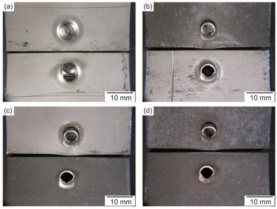 To assess the findings of the quasi-static shear tests, the fracture surfaces of the specimens were examined, as shown in Figure 17. In the case of the AR-AR specimens (see Figure 17a), the sheet on the punch-side cracked in the neck area before it was pulled out from the clinch joint. For all other series, in Figure 17b–d, the sheet metal on the punch-side remained in the joint until it was completely torn off. In this process, the non-joined sheet metal on the die-side below the clinching point was also deformed.
